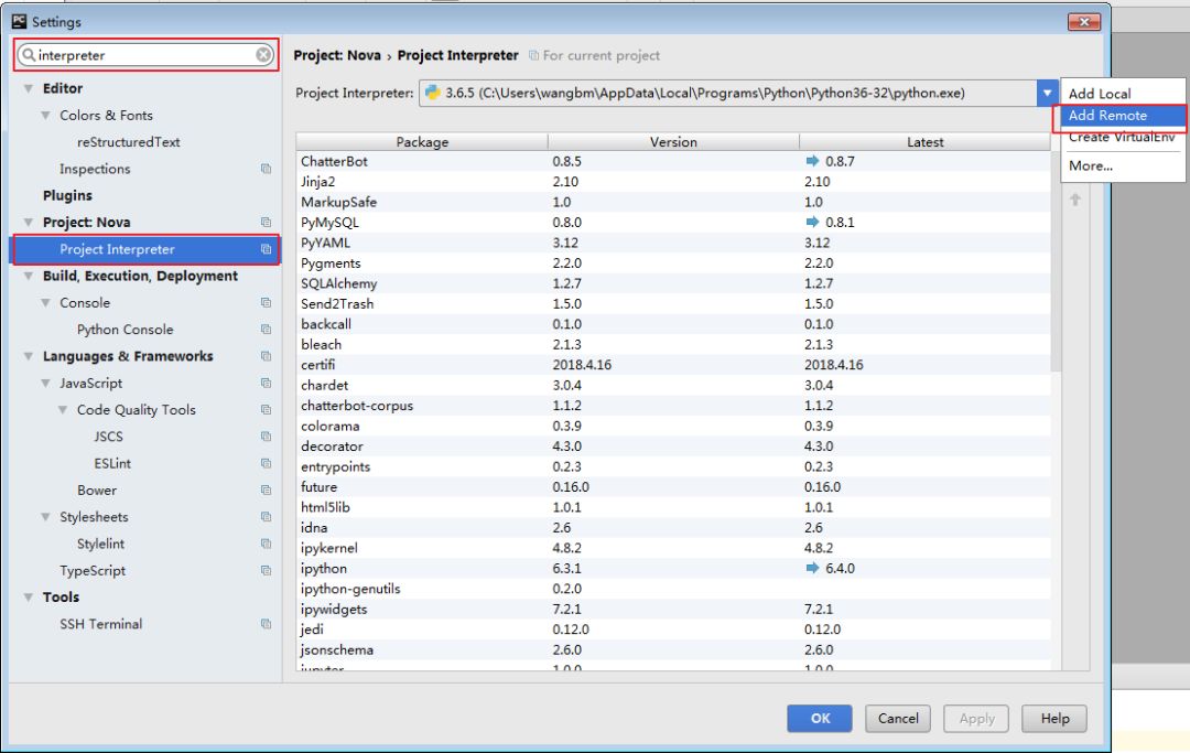 进入 File -> Settings按图示,添加远程解释器。
