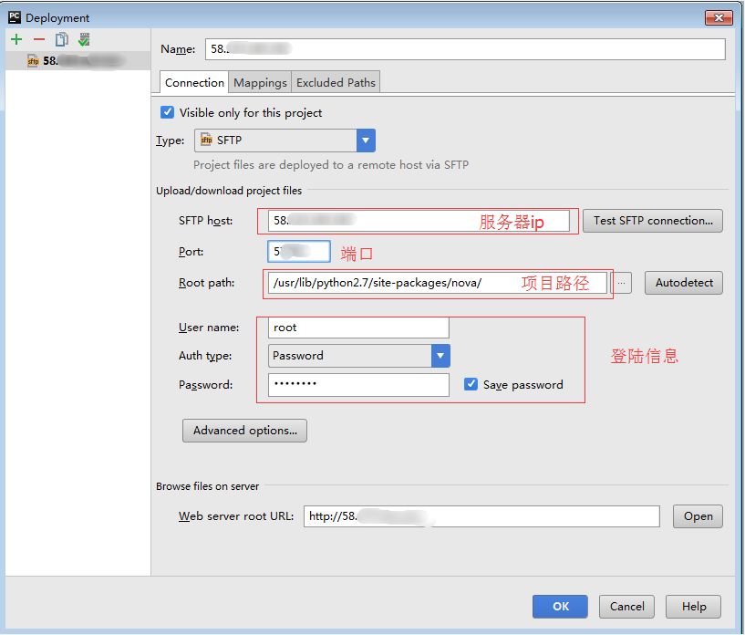 填写远程服务器信息,跟之前的一样,不再赘述。