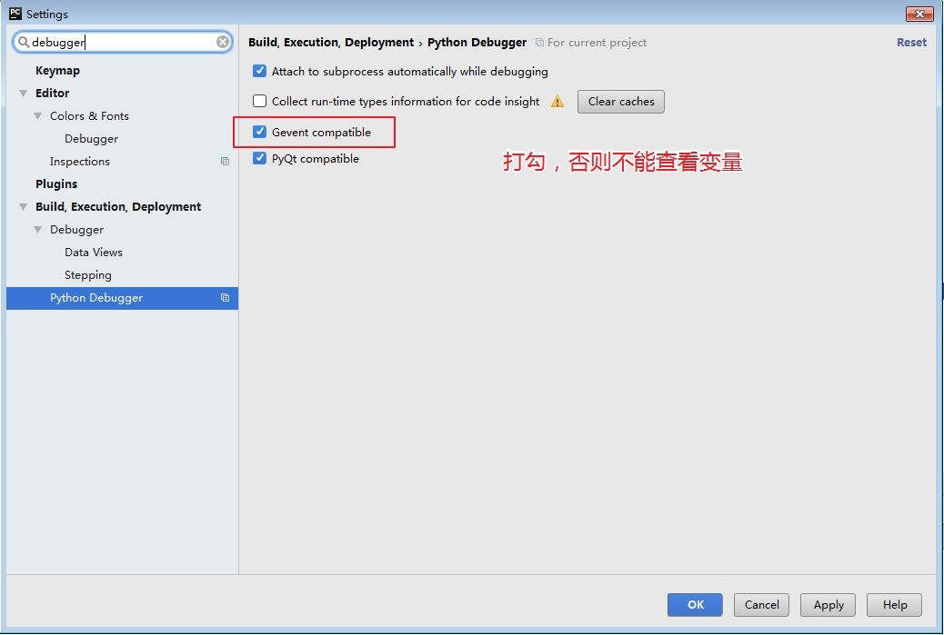 开启Gevent compatible,如果不开启,在调试过程中,很可能出现无法调试,或者无法追踪/查看变量等问题。对于这个设置,官方解释是这样的,我没有看懂。