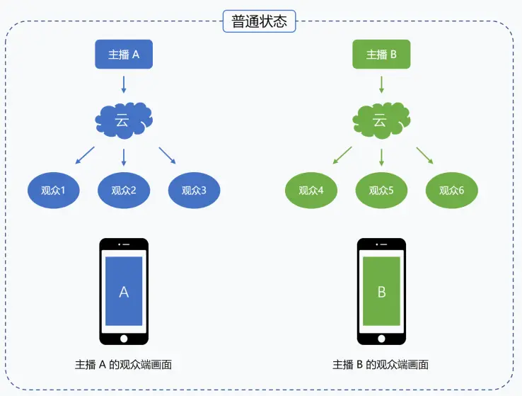 这样一来,原本在观看主播 A 和 主播 B 的观众,不会遭遇任何的画面二次加载和卡顿等待,只是会看到原本一个画面一分为二,自然而然的进入到 PK 状态。