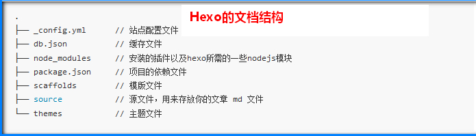 当安装、配置完成hexo之后,可以看到hexo的文档结构如下: