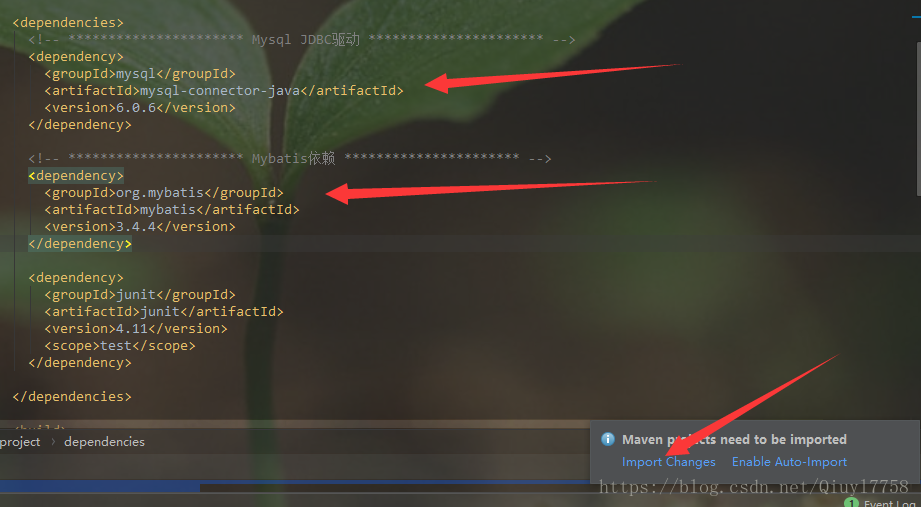 3.1 在pom.xml文件内添加Mysql驱动和Mybatis依赖,然后点击右下角的import。