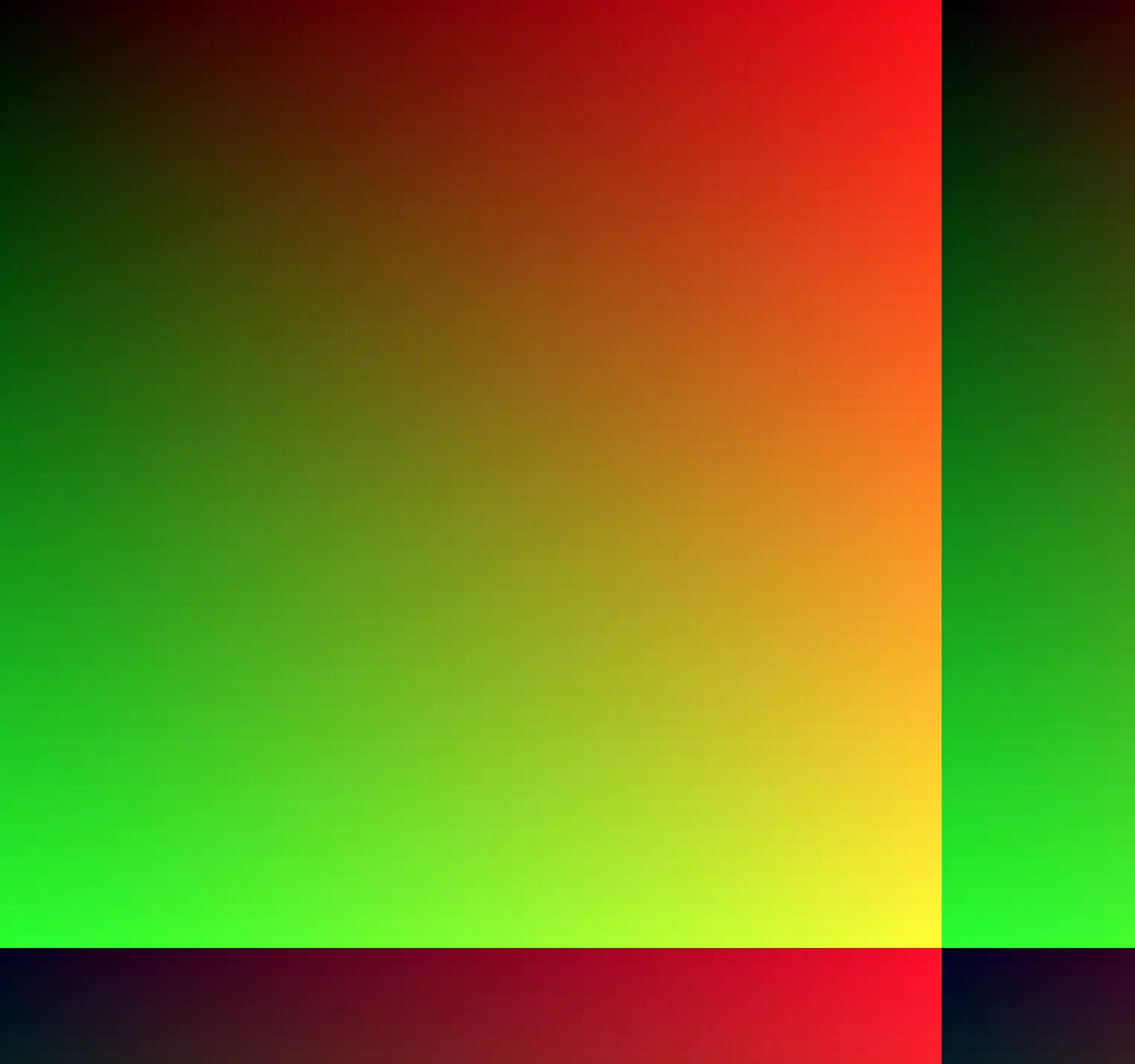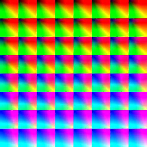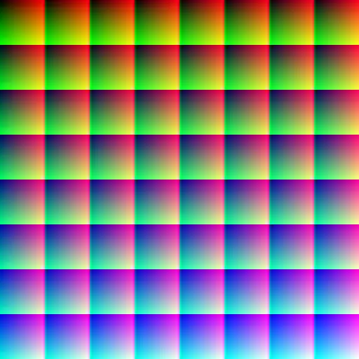 它在横竖方向上分成了 8X8 一共 64 个小方格,每一个小方格内的 B 分量为一个定值,总共就表示了 B 分量的 64 种可能值。同时对于每一个小方格,横竖方向又各自分为 64 个小格,横向小格的 R 分量依次增加,纵向小格的 G 分量依次增加,通过放大图片可以看到如下细节