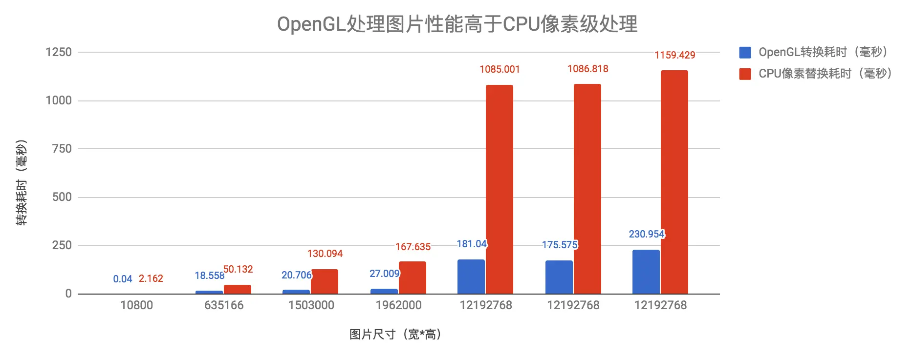 可以看到效果和 OpenGL-ES 非常接近,也是很理想的处理效果。但是 CPU 处理像素相比于 GPU 的并行计算性能是很糟糕的,这里以几张不同尺寸的图片,在 iPhone 8 Plus 上对两种方式进行了测试,获得性能比较结果如下。
