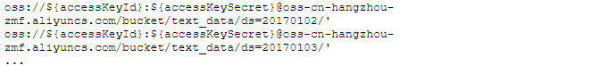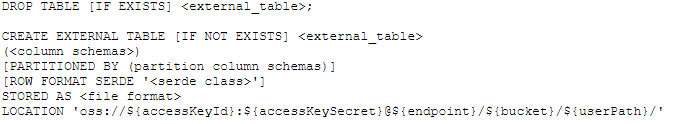 <column schemas>必须与具体OSS上存储存储数据的schema相符合。 ROW FORMAT SERDE并非必选选项,只有在使用一些特殊的格式上,比如TEXTFILE时才需要使用。STORED AS后面接的是文件格式名字, 比如 ORC/PARQUET/RCFILE/SEQUENCEFILE/TEXTFILE 等等。- 最后还要提到的是,在上面这个例子中,我们在LOCATION上使用了OSS明文AK,这只适用于在用户对于AK的保密性不敏感情况下使用。 对于数据安全比较敏感的场景,比如在多用户场景或者弹外集群上,则推荐使用通过STS/RAM体系事先进行鉴权,从而避免使用明文AK。