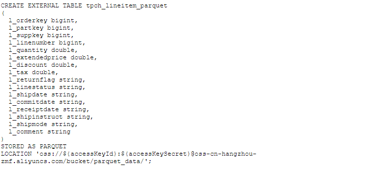 现在再来看一个具体的例子,假设我们有一些PARQUET文件存放在一个OSS路径上,每个文件都是PARQUET格式,存放着schema为16列(4列BINGINT, 4列DOUBLE, 8列STRING)的数据,那么可以通过如下DDL语句来描述: