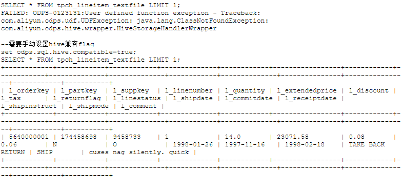 注意,上面例子中的tpch_lineitem_textfile表,因为使用了ROW FORMAT + STORED AS,需要手动设置flag(只使用STORED AS,odps.sql.hive.compatible默认为TRUE),再进行读取,否则会有报错。