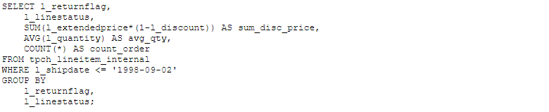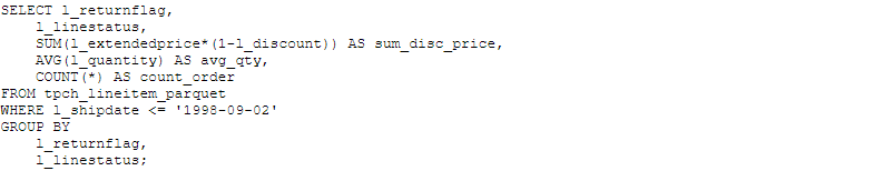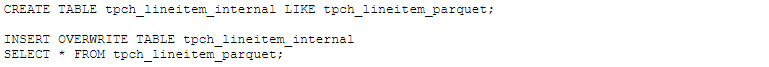对比上面的两个范例,可以看出对于不同文件类型,只要简单修改STORED AS后的格式名。在接下来的例子中,我们将只集中描述对上面PARQUET数据对应的外表(tpch_lineitem_parquet)的处理,如果要处理不同的文件类型,只要在DDL创建外表时指定是PARQUET/ORC/TEXTFILE/RCFILE/TEXTFILE即可,处理数据的语句则是一样的。