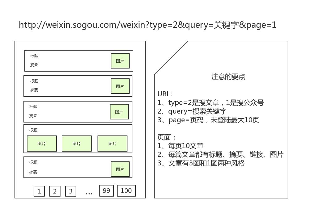 在搜狗微信搜索中,每一页有10条数据,每条数据都是一篇微信文章。我们需要获取其中的标题、摘要、链接、图片这四个信息。