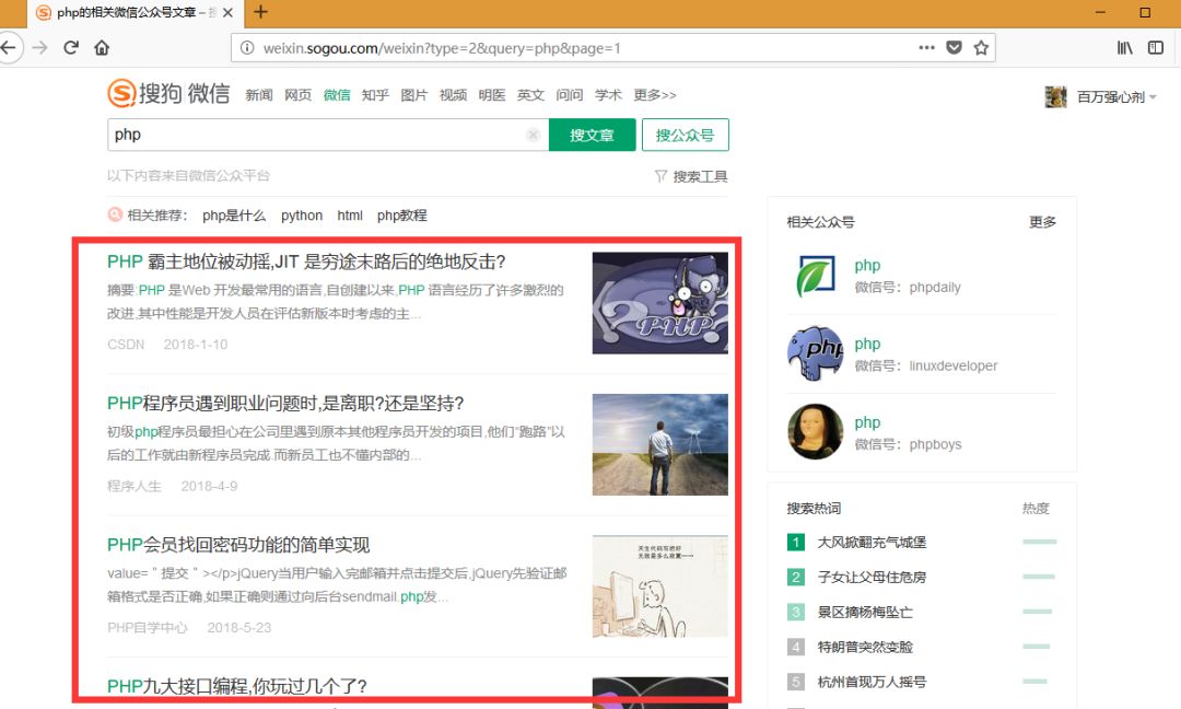 在搜索中前5篇来源于搜狗,后0~2篇来自于这个公众号。在分页的时候其实是两部分联动搜索,在搜狗中以5为单位和在本地数据库以2为单位,在不同的区域分别搜索,组合结果。搜索引擎一页10篇,5正好分10为上下两页。