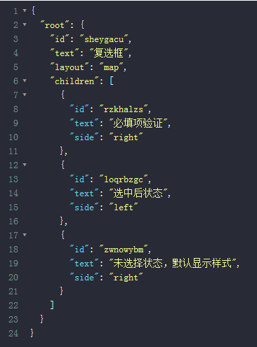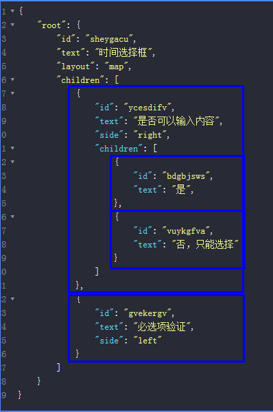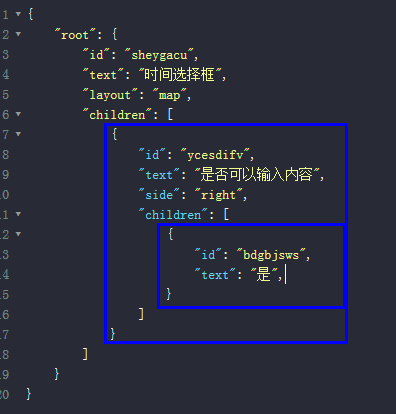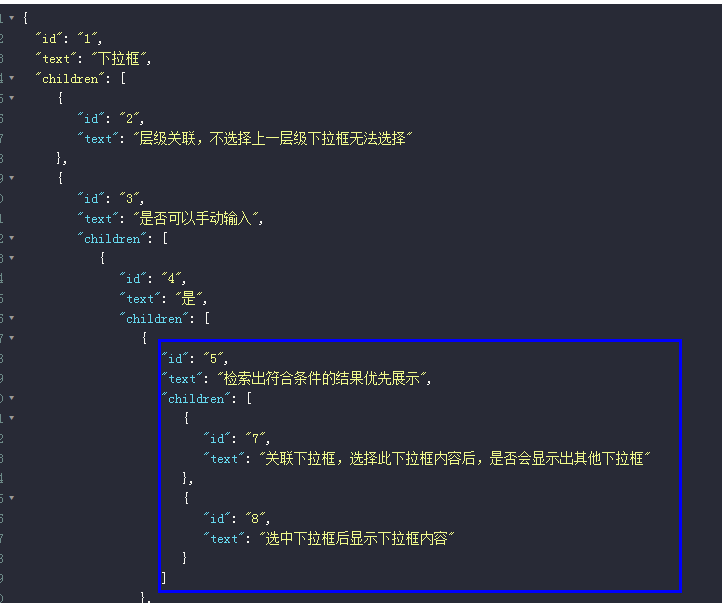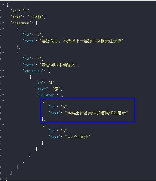 2、第二个例子是递归查找目标节点(节点id为targetId,有且只有一个),找到后把targetChildren赋值给节点的children, 举个例子,原始JSON如下,查找的目标节点id为5: