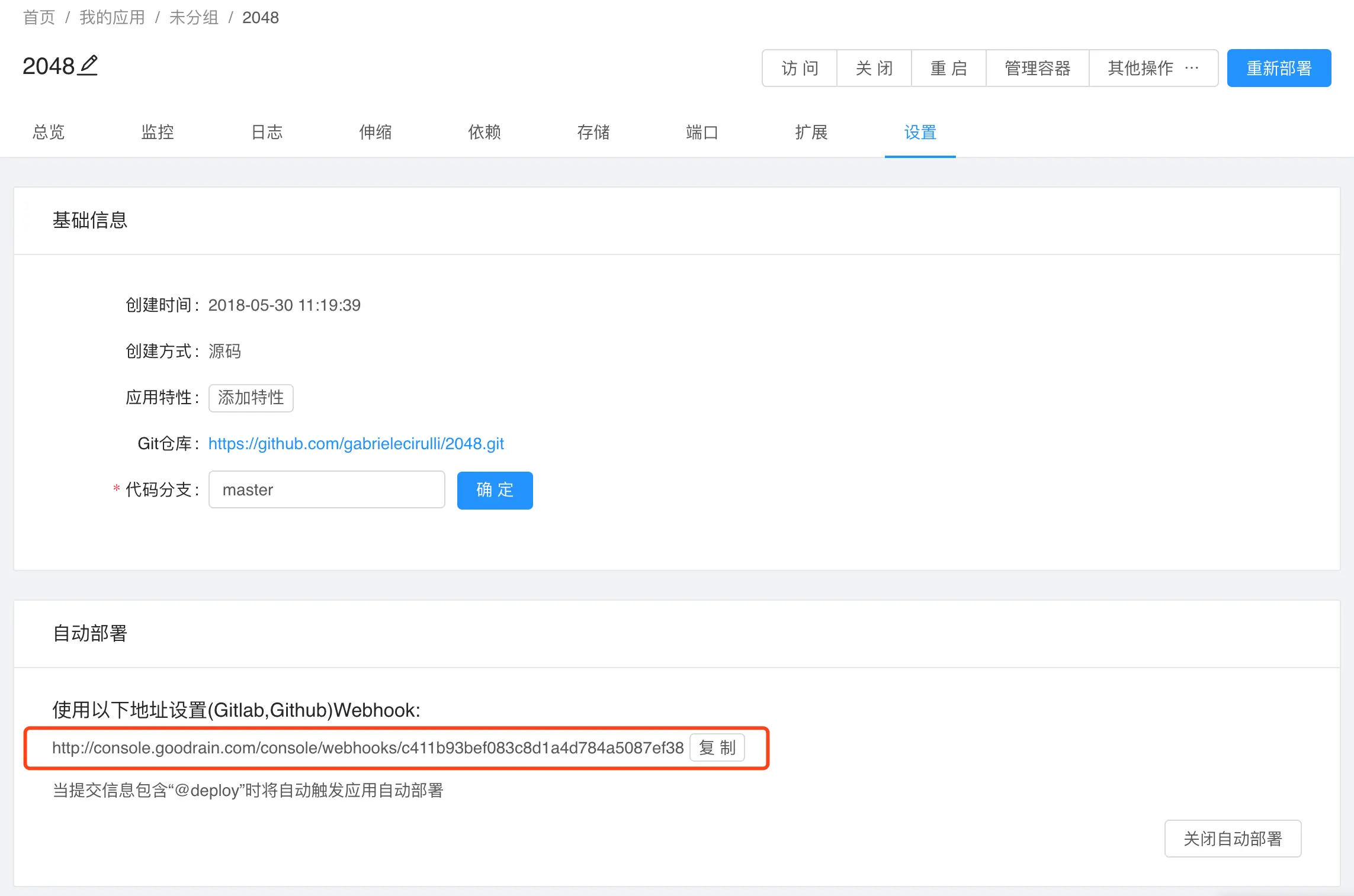 过去通过源码构建应用,在向仓库提交新代码后需要进行重新部署操作。为了消除这一重复耗时的低效工作,Rainbond提供基于webhooks的应用自动部署功能,只需简单设置即可生效。