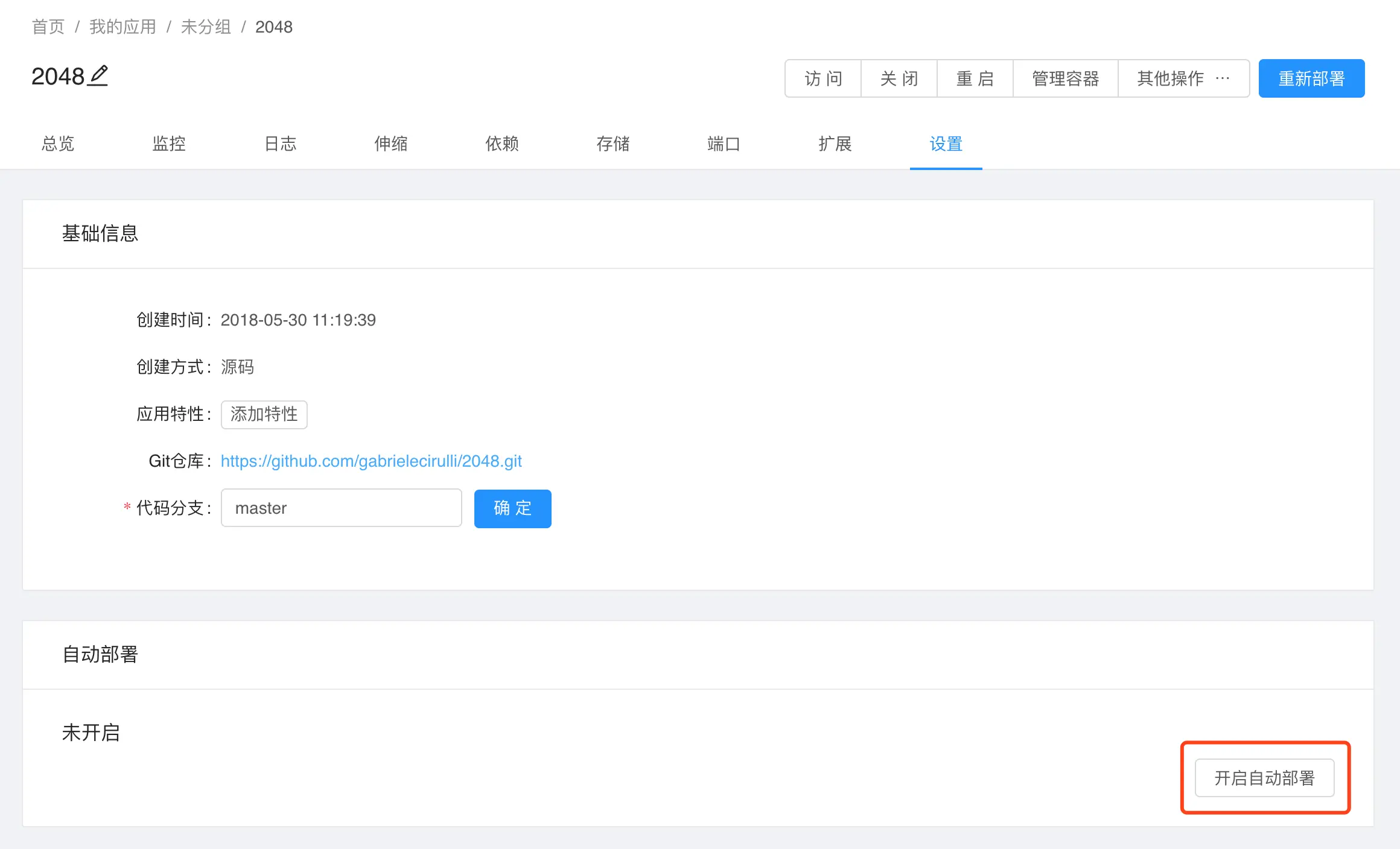 设置自动部署前,请检查应用是否由源码创建(Rainbond官方demo除外),目前支持Github和Gitlab两种代码仓库。非源码创建应用暂不支持此功能。
