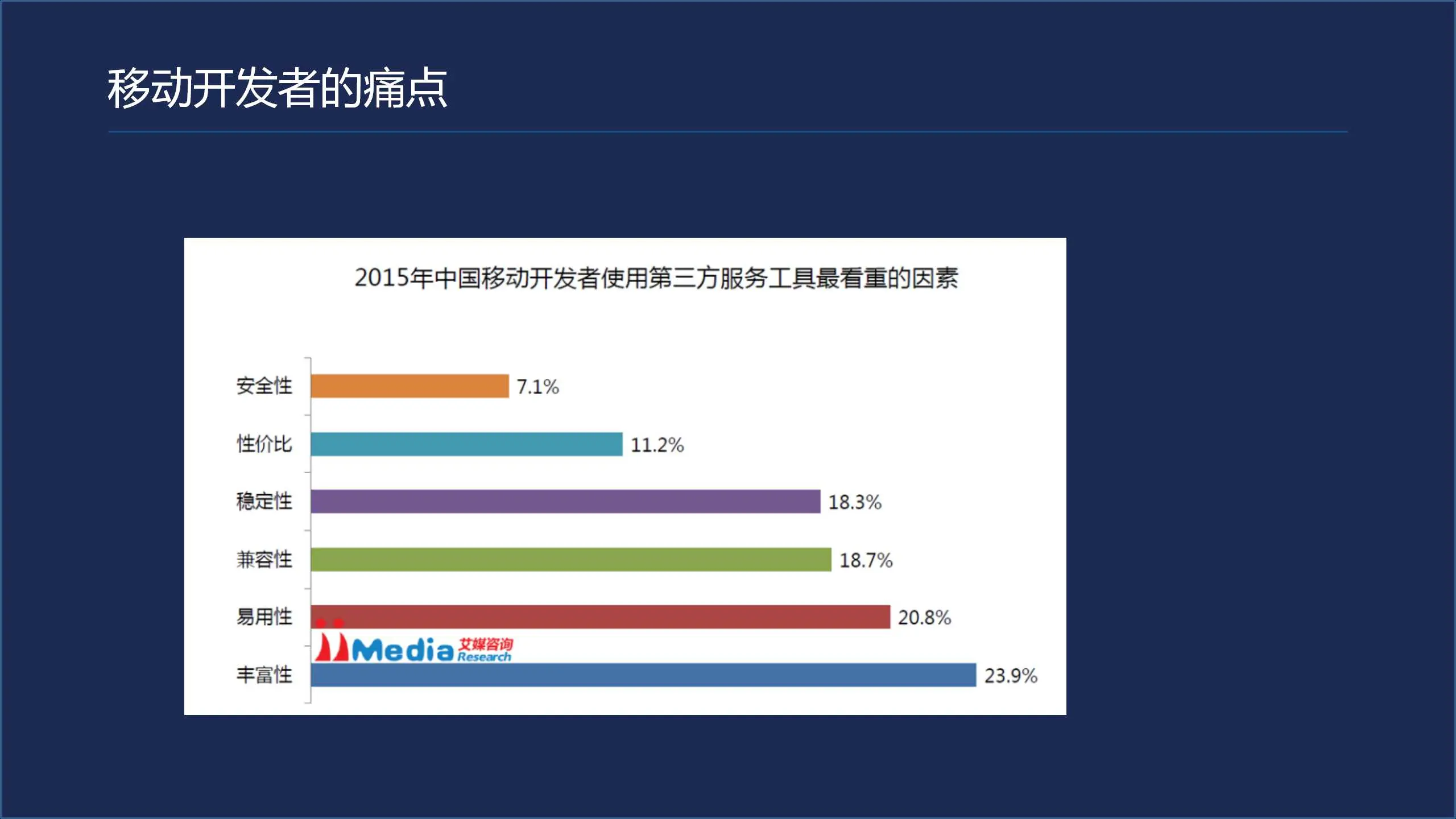 我觉得这种事情其实应该规范化、批量化,我们应该给移动开发者提供一个更好的服务,将整个移动开发作为一个整体的服务。我想起2015年看到的某咨询机构调研中的一个片断,当时的体会并不是特别深,但当我做完这个应用的时候,脑海里就想起了这个图。2015年中国移动开发者使用第三方服务工具最看重的因素,排名第一和第二的分别是丰富性和易用性。刚看到时也没有特别大的感受,但2017年在进行应用的时候发现确实是这样。丰富性和易用性,是我们移动开发者真正考虑的很重要的因素。