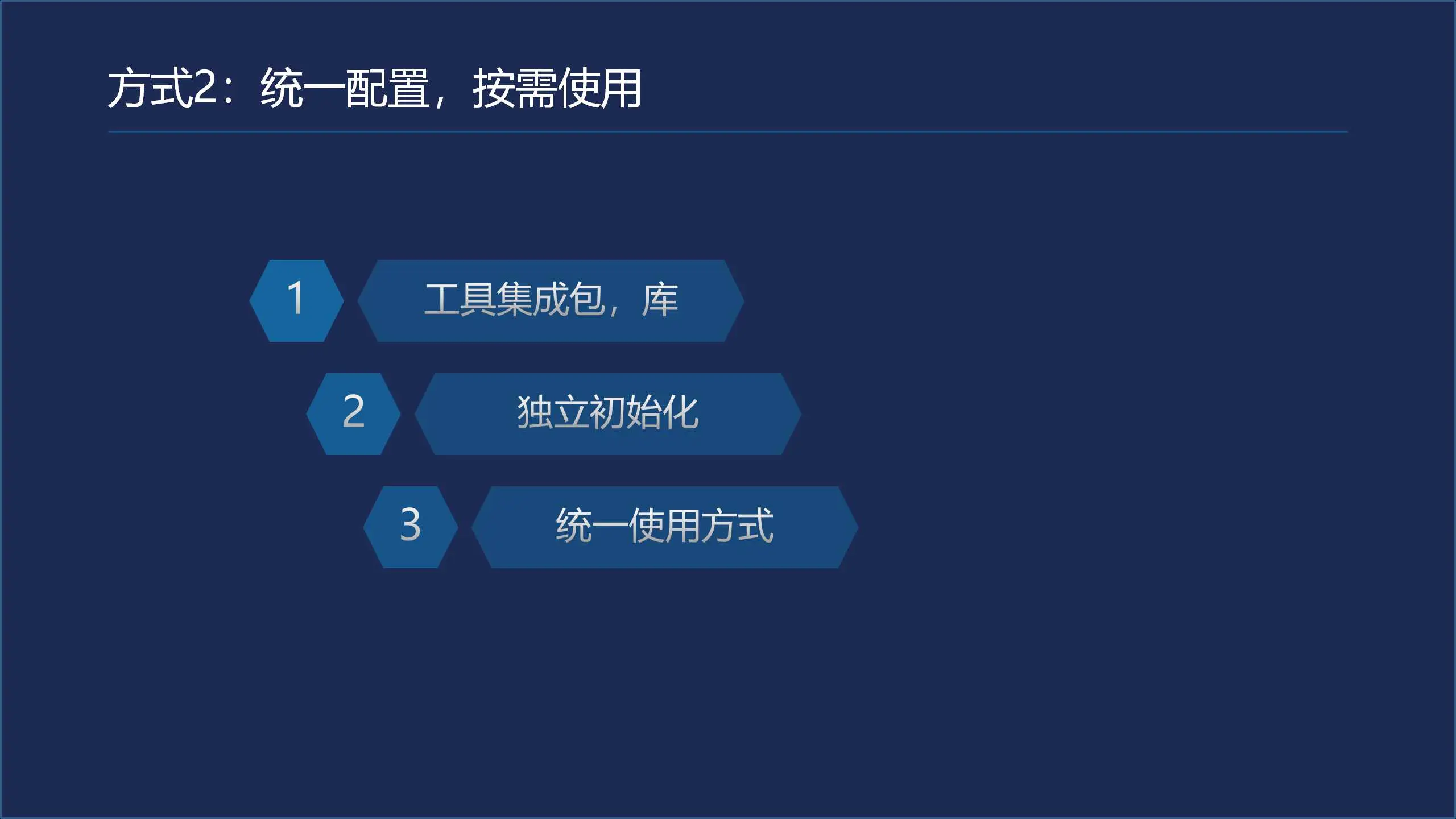 第二种模式,统一配置,按需使用。现在我们使用的也主要是这种方式,所有包的集成和使用都是用配置来实现的,集成是不需要任何代码,通过配置方式去做的。然后各自独立初始化,这点可能大家觉得初始化跟之前还是一样,但其实会有点不一样的点。正常情况下是不需要初始化的,比如使用标准配置就不需要进行初始化。但是如果需要定制服务,比如说我的分析是多少秒上报一次或实时上报,还是说一段时间整合在一起上报或达到一定的量上报,这是开发者根据他的需要去做独立配置的,这种情况就需要去做初始化,做不到零代码集成。你使用标准配置的情况下,你的使用和初始化集成都是零代码的,但当你需要做定制的时候可能就需要代码去做一些事情。