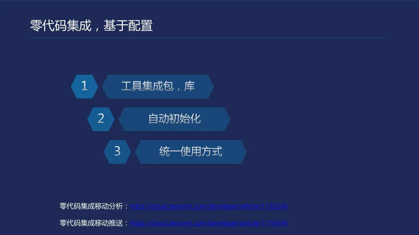 首先集成跟以前一样,通过配置的方式去集成,零代码。二是初始化,刚才说对于标准情况能做到自动初始化的,但对于定制的服务需要代码,现在针对这种情况也是基于配置来做,配置完之后一下载就自动初始化了。这种情况下所有的集成和初始化全部用配置文件来做,真正做到零代码的集成。