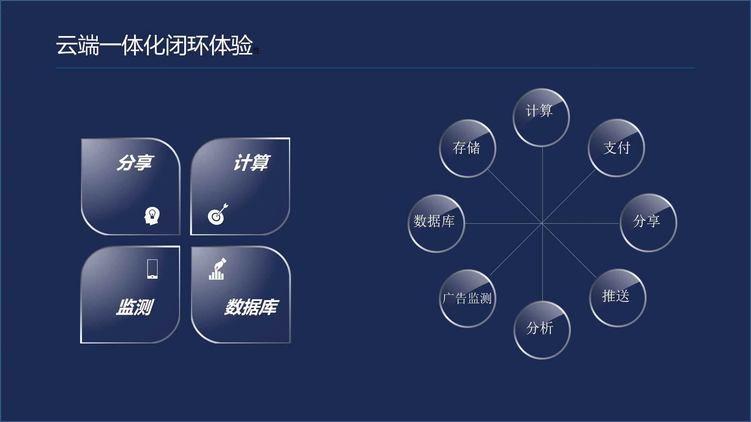 第三是计算,第四是数据库。我们希望优化中国移动开发的方式,不再和后台强耦合,直接通过云端去构建整个应用,从demo到上线、运行、上量,我们的计算服务都是可用的,提供的是弹性的能力,现在能用上线之后也能用,数据库也是。我们希望通过这些产品打造云端一体化的产品闭环体验,从开始的计算、数据存储、文件存储到后面用户的分析、广告的监测,用户的推送和活跃的运营、支付,一切都在一个平台上可以做到。从研发、测试、发布、运维到运营,希望我们的移动开发平台能成为整个开发生态闭环的产品。