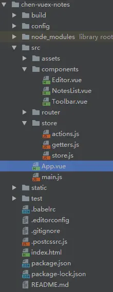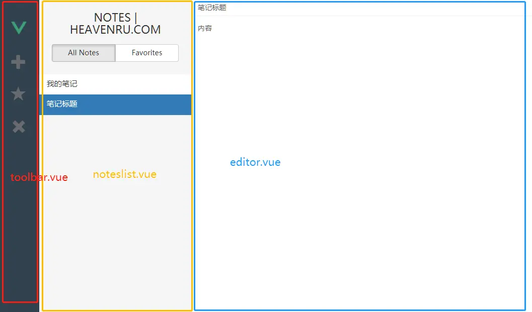 在这个项目中,我们将总共使用四个组件:根组件 App.vue,操作栏组件 Toolbar.vue,别表组件 NotesList.vue,笔记编辑组件 Editor.vue。