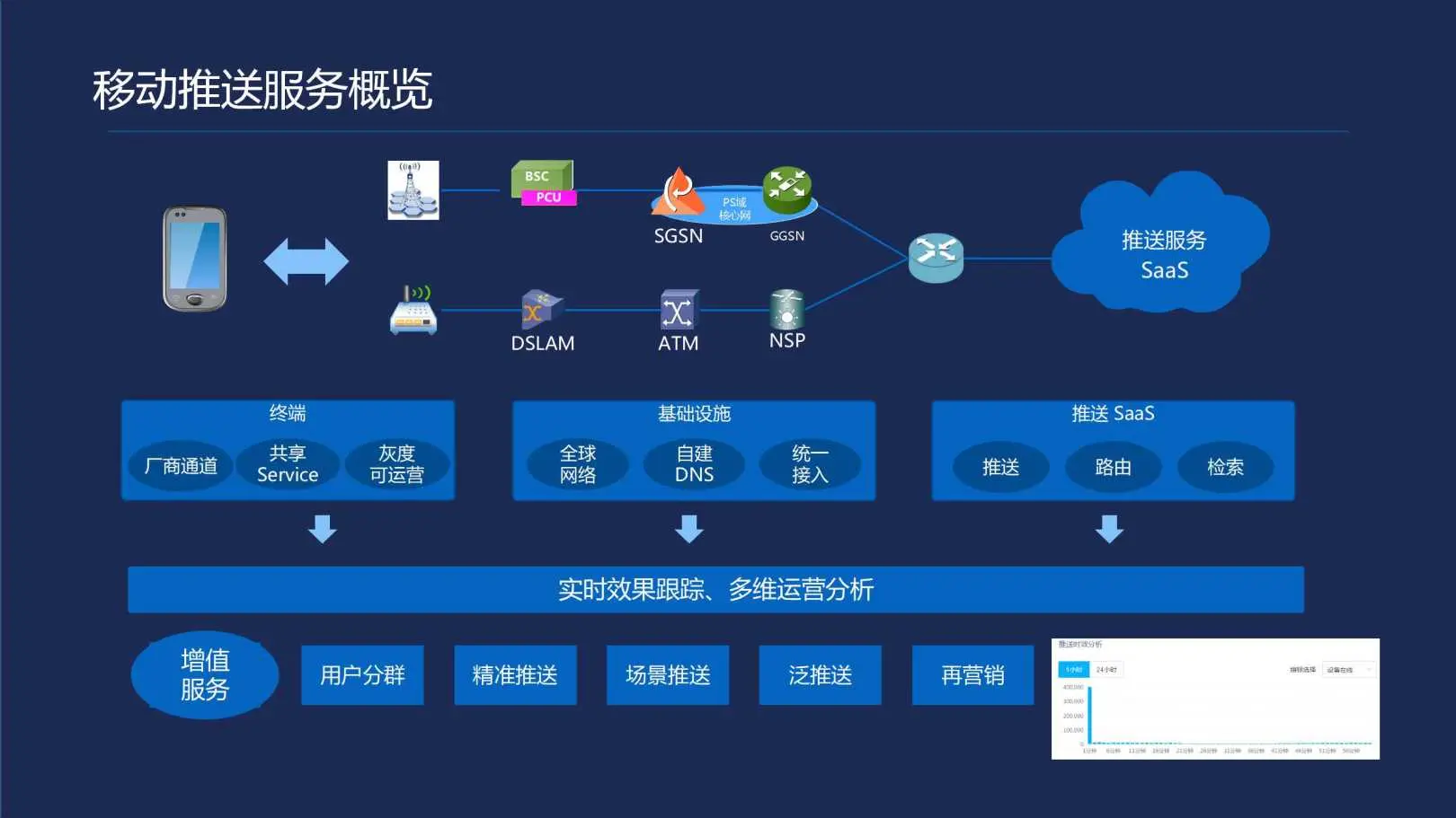 第一部分是关于推送系统的建设,主要有三个子块,终端、后台、云化治理。第二部分的内容是增值服务,包括精准推送流程、数据、基础支撑平台、可视化操作。对于消息推送来说有三个主要环节,第一个环节是先检索出我们需要推送的目标用户,第二步是选择合适的通道进行消息的分发,最后是终端收到消息后进行展示。对于移动推送服务来讲,最基础的是需要做精做细,在终端、后台、数据服务这三个层次。