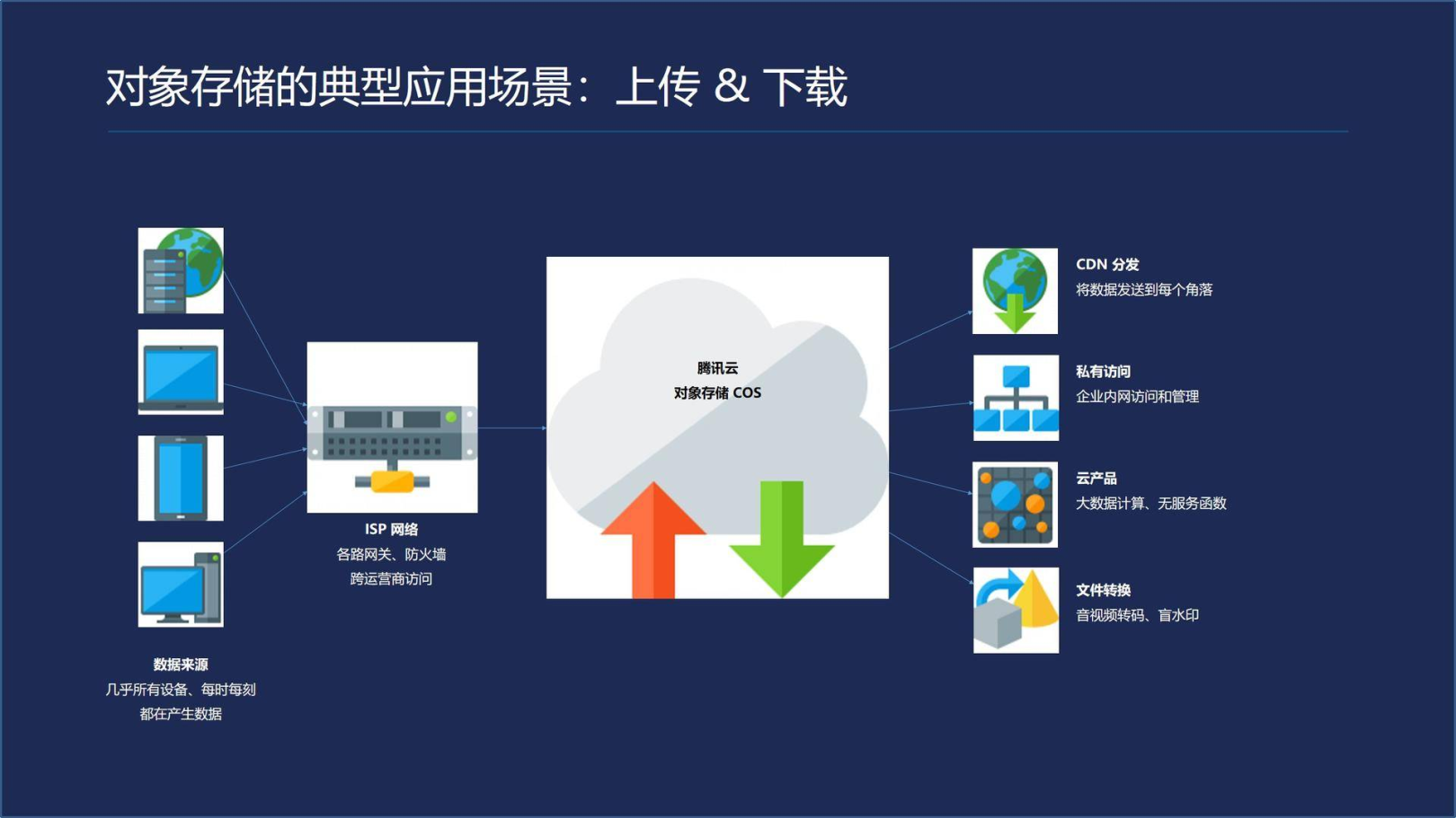 腾讯云存储业务终端负责人董朝介绍,腾讯云有一个整体的COS服务,是一个对象存储服务。数据传送上来之后,会在COS的系统内部整体仓储起来,并配合腾讯云已有的,如CDN的能力帮助用户去分发。这样,对于终端的开发者来说,只需要一个SDK,剩下所有的事情都可以交给腾讯云托管。