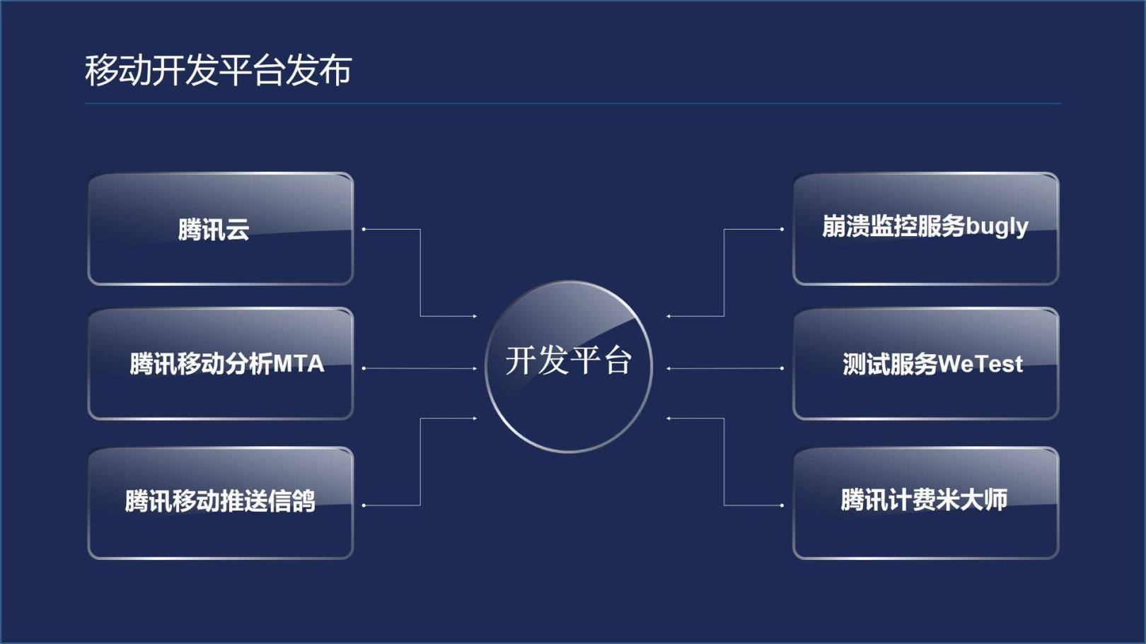 腾讯云,腾讯移动分析,腾讯移动推送信鸽,崩溃监控bugly,腾讯计费米大师联手推出移动开发平台,打造移动开发新模式: 移动开发即服务(mobile as a service),首创零代码集成,基于配置的云端一体化闭环开发体验。