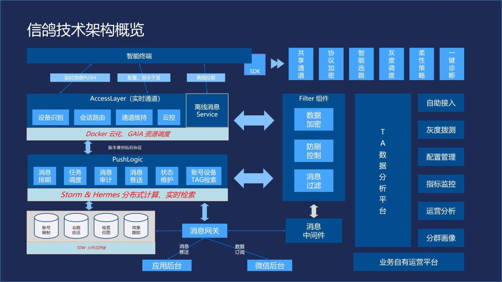腾讯信鸽包含了终端、接入层、后台逻辑层,存储、数据分析平台、消息网关这几大部分。对于数据分析平台来说,给用户提供实时的效果跟踪,多维分析的能力。整套系统构建在Docker云化基础之上。经过这一两年的建设之后,信鸽现在初步形成了一个高性能、架构可伸缩、易于运维的系统。