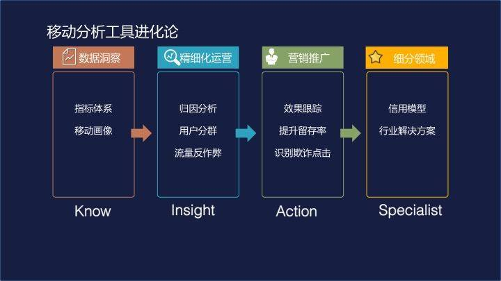 最开始要看指标和报表,要汇总来自不同平台的数据;到了APP初具规模,开始有付费和盈利模式,企业就进入了精细化运营的阶段。这个阶段更加关注付费转化、流失等用户行为。接下来就是有针对性的做营销推广,引流新用户。如何把控广告的投放、APP的下载、最终完成注册和付费的各个环节,如何衡量营销的效果,成为这个阶段关注的问题;做完前面这些步骤以后,还可以更进一步,利用大数据的手段解决细分行业的痛点难点。输出一套行业的标准化解决方案,帮助新来的企业快速突破运营问题。