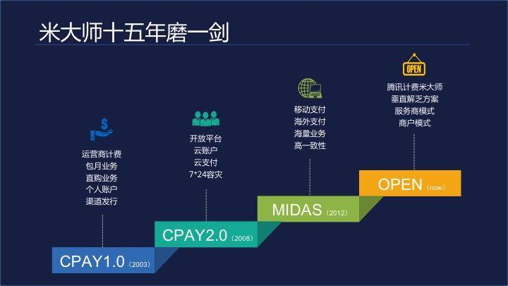 腾讯计费架构师段克晓表示,米大师的成功绝非一朝一夕之功,而是经过了15年的打磨,这期间经历过了运营商计费,云支付开放平台,移动支付米大师和开放四个阶段。