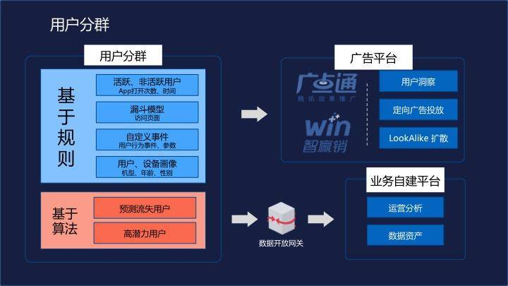 同时,MTA系统和 SPA、WIN 等广告平台打通,支持在腾讯几乎所有流量上的广告定向投放,也可以用 Lookalike 的方式,扩散获取新用户。