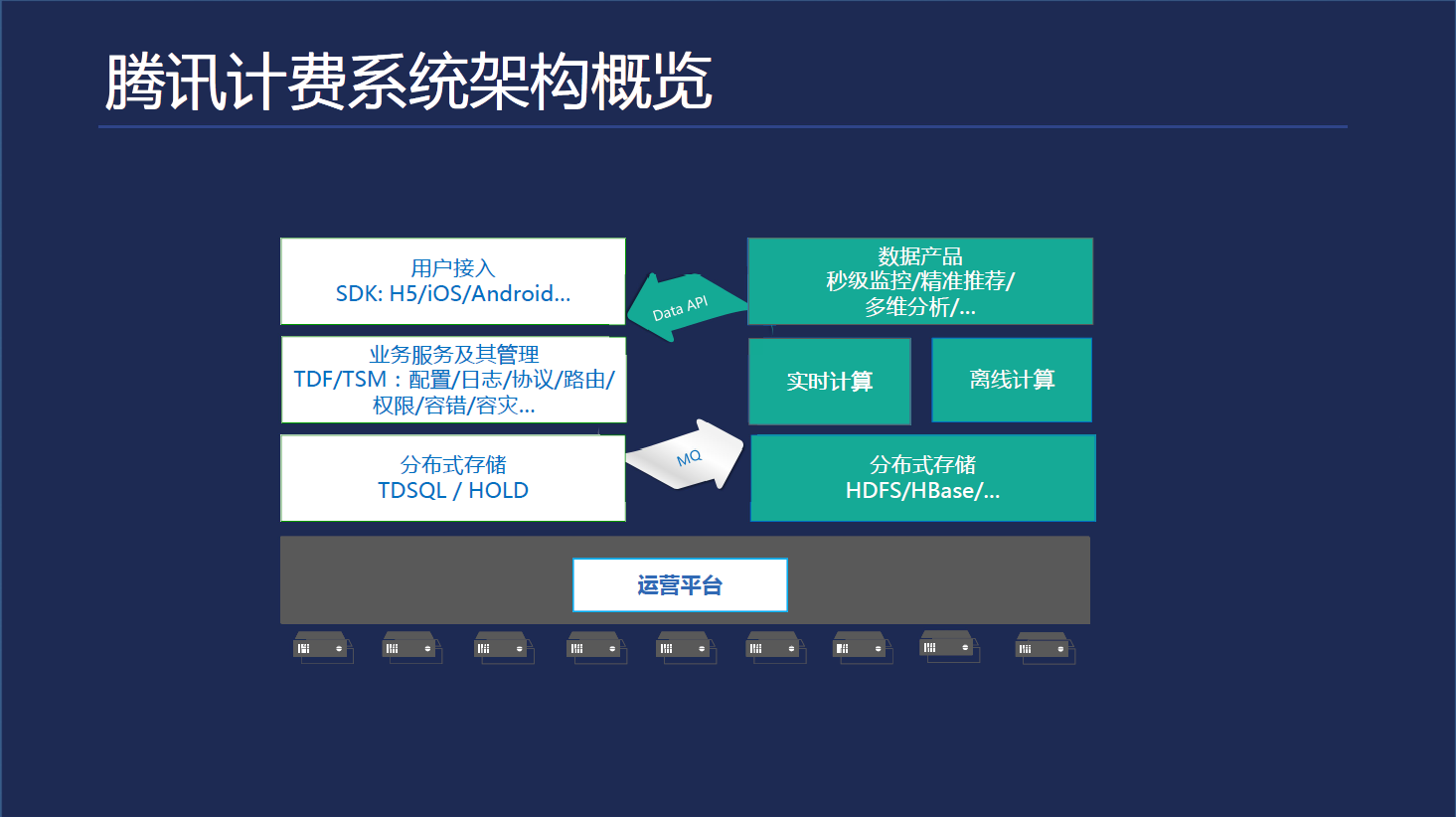 段克晓介绍说,米大师首先是一个全平台的支付SDK入口,通过网络路由和系统容灾,选择一个最近最快捷的接入点进入支付系统,经过风控安全交易,完成扣款后,需要进一步将交易落地到DB,对于海量交易,需要分布式存储架构,防止存储服务宕机。和支付系统并存的就是数据服务,需要对用户的历史交易,用户的画像特征进行分析,为用户推荐最优的交易方式,最优的营销活动。任何系统的异常都要能进行可视化监控告警。直观上,整个腾讯计费系统由在线交易,数据服务和运营平台三大系统组成。