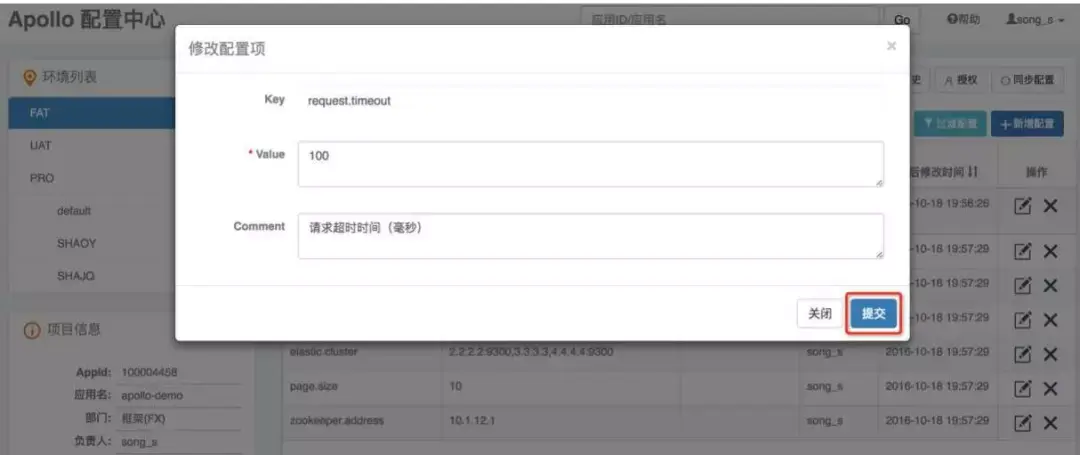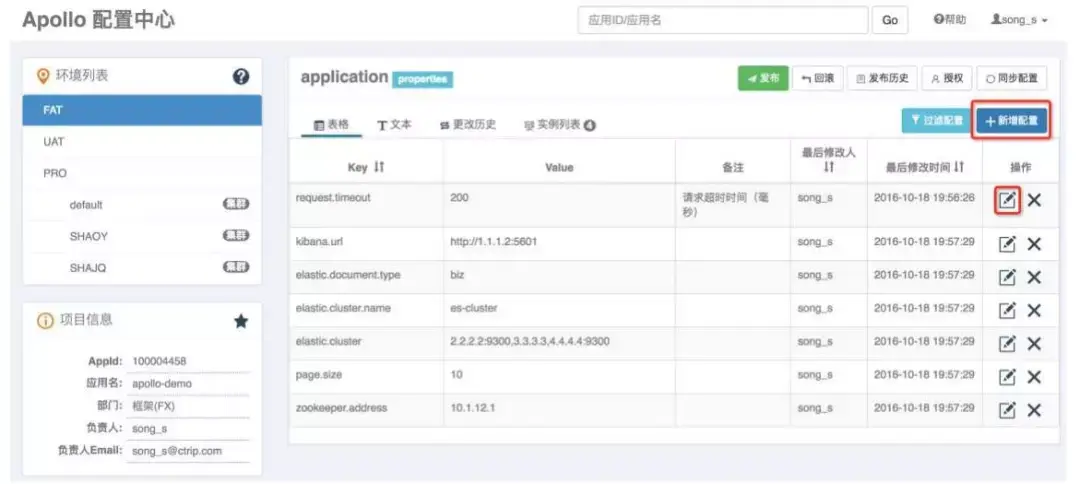 Apollo中添加修改配置项可以通过新建或修改配置的按钮直接操作。需要注意的是修改的配置不会即时生效,而是需要点击发布后才能生效。
