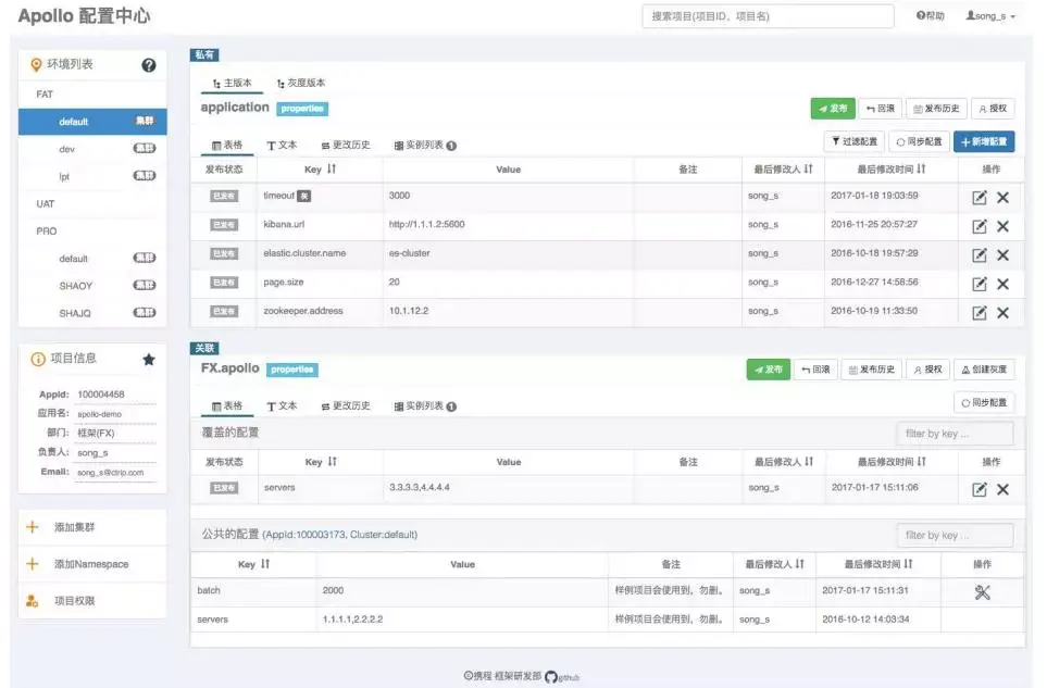 上图是Apollo的配置中心界面,左上方是一个环境列表,列出了当前应用的所有环境,下方是一些项目信息。右侧的两部分可以简单的认为是两个文件,其中Application每个应用都具备,默认的配置管理通过表格形势展现,可以看到这其中还有更改历史、修改人之类的信息以及一些功能按钮。
