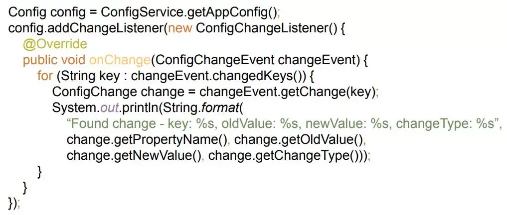 而通过上面的代码可以让开发人员实时的获取到配置的变化,Apollo提供了事件触发机制,只需要添加一个addChangeListener就行了,每次配置变化的时候会调用onChange方法,并且传入对应配置变化的事件,这个事件包含配置项的改变。