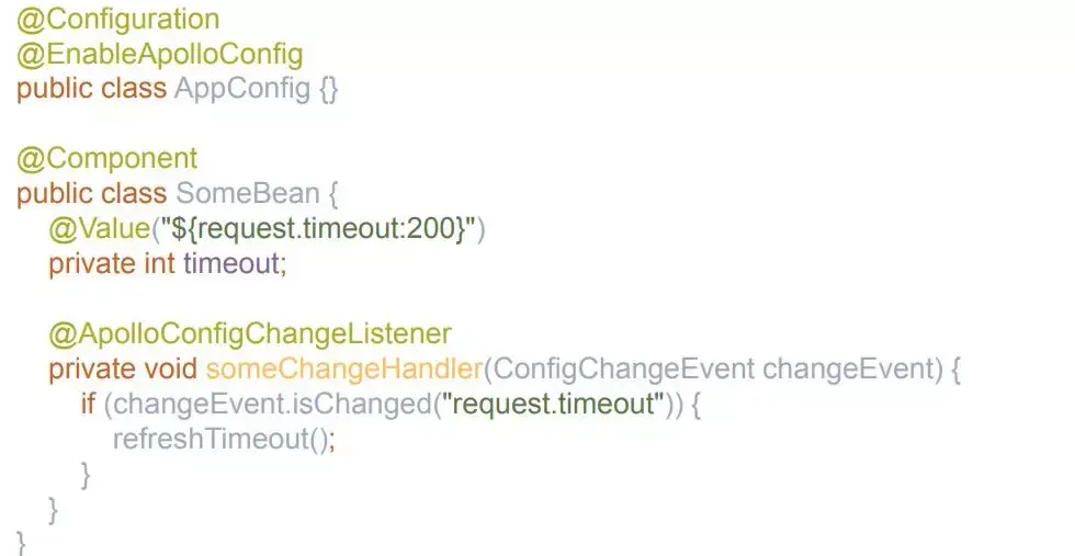 对于Spring集成的简单用法只需要在AppConfig类上添加EnableApolloConfig。实际的配置中我们还是建议使用下方的方式,它同样支持配置变化事件。