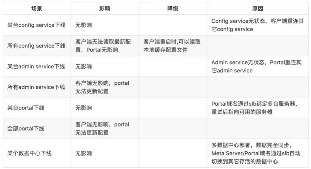 图中最下方的Config Serivce主要提供配置的读取、推送等功能,服务对象是客户端。Admin Service则是提供对配置的修改、发布、审计这些功能,服务对象是Apollo服务界面。这两个服务都是多实例无状态部署。