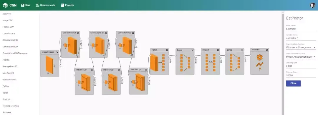 通过 TensorEditor,我们不仅可以创建深度网络并避免一些常见的代码问题,同时还能生成基于 TensorFlow Estimator 的高效代码。如下所示,机器之心尝试构建了一个简单的卷积网络,我们使用了两个卷积层、两个池化层和一个全连接层,并在最后的 Estimator 使用了交叉熵损失函数和 Adagrad 最优化方法。