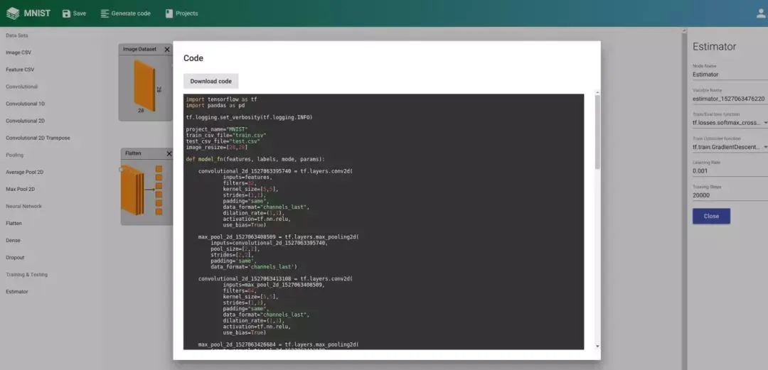 生成代码:搭建完深度架构,我们就能直接生成可执行的 TensorFlow 代码(Python 2.7)。