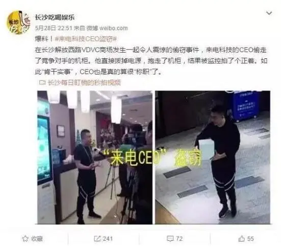 日前,来自@长沙吃喝玩乐的微博爆料,来电科技CEO袁炳松在长沙解放西路VDVC商场发生了一起令人震惊的偷窃事件,来电科技CEO竟然偷走了竞争对手的共享充电宝机柜,全程被监控拍下。