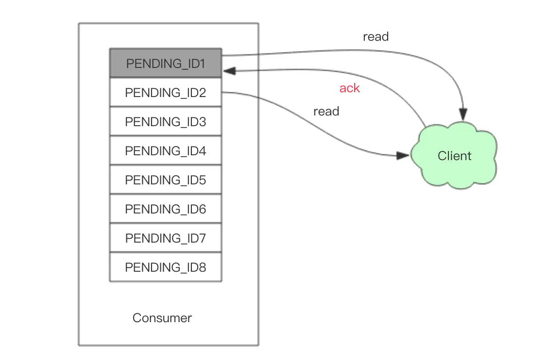 Stream提供了xreadgroup指令可以进行消费组的组内消费,需要提供消费组名称、消费者名称和起始消息ID。它同xread一样,也可以阻塞等待新消息。读到新消息后,对应的消息ID就会进入消费者的PEL(正在处理的消息)结构里,客户端处理完毕后使用xack指令通知服务器,本条消息已经处理完毕,该消息ID就会从PEL中移除。