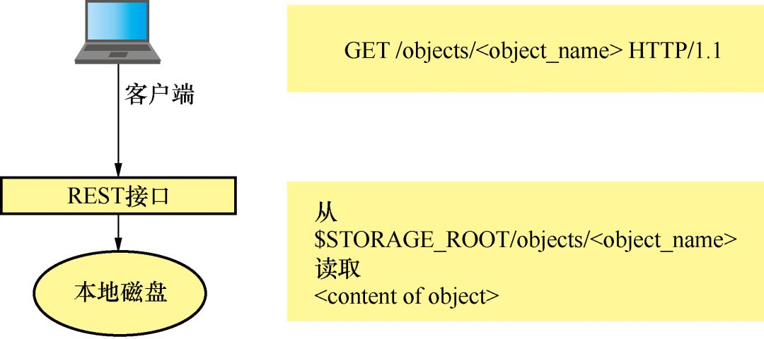在一台服务器上运行了一个HTTP服务提供的REST接口,该服务通过访问本地磁盘来进行对象的存取,见图1-1。