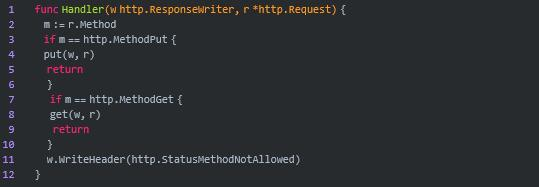 Handler函数会首先检查HTTP请求的方法:如果是PUT,则调用put函数;如果是GET,则调用get函数;两者皆否,则返回HTTP错误代码405 Method Not Allowed。