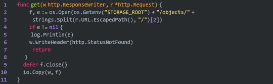 和put函数类似,get函数首先获取<object_name>并调用os.Open尝试打开本地文件系统根存储目录objects子目录中的同名文件f,如果打开失败,则返回HTTP错误代码404;如果打开成功,则用io.Copy将f的内容写入w,此时f作为读取内容的io.Reader,而w则作为写入的io.Writer。