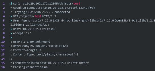 接下来我们用curl命令作为客户端来访问服务器,试图GET一个名为test的对象。