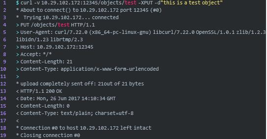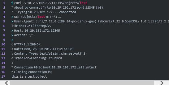 我们用curl命令PUT了一个名为test的对象,该对象的内容为“this is a test object”。服务器返回“200 OK”表示PUT成功。接下来让我们再次GET这个test对象。