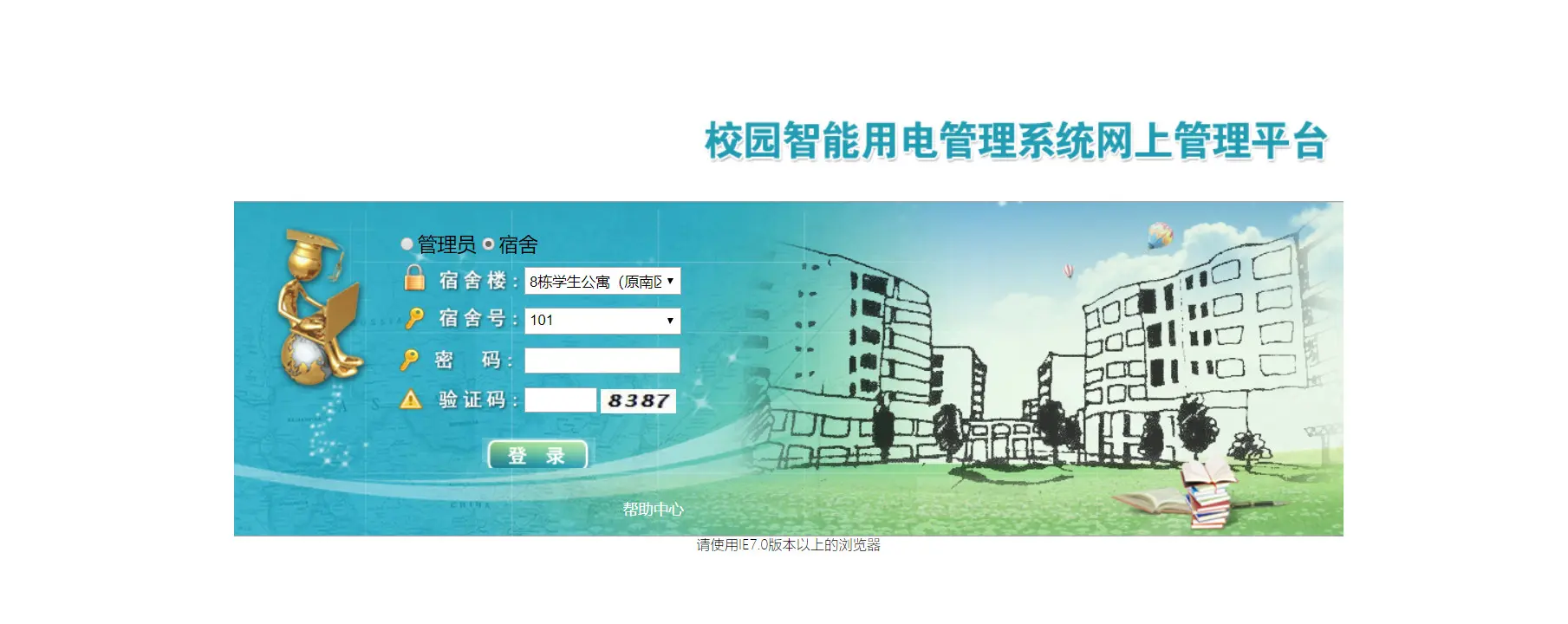 这个网站需要先登陆进自己的宿舍才能进去,还有很烂的验证码,不过我实现到验证码写入的时候发现这个验证码是可以随便填的,这个就感觉有点垃圾。