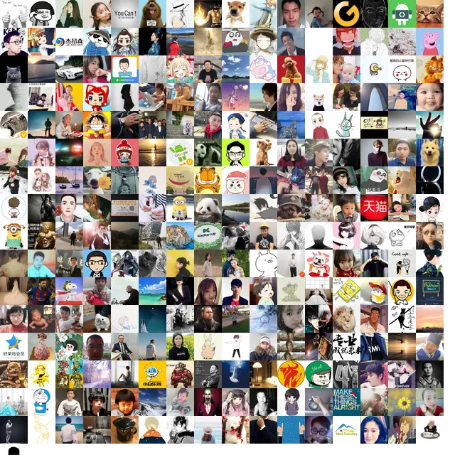 获取好友信息,get_head_img拿到每个好友的头像,保存文件,将头像缩小拼接至一张大图。