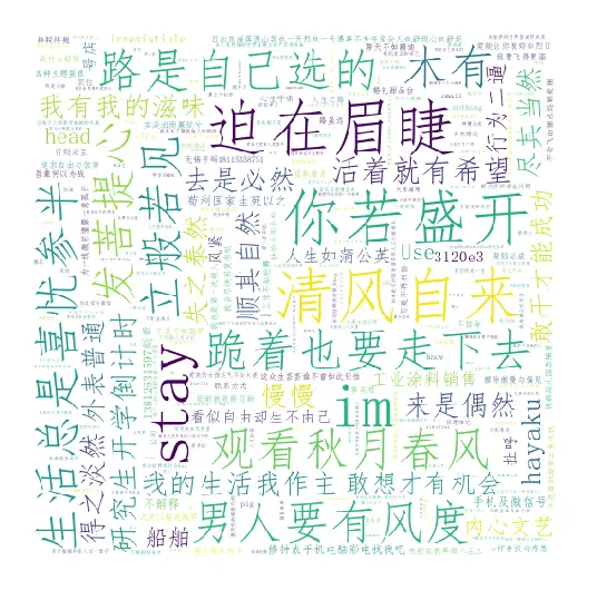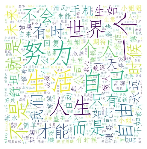sign.txt文件里写入了所有好友的个性签名,使用wordcloud包生成词云图,pip install wordcloud