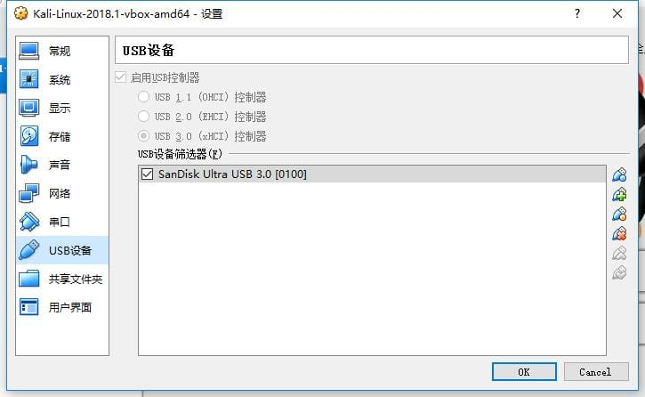 - 修改已经导入的Kali虚拟机的设置,在USB设备选项中选择
