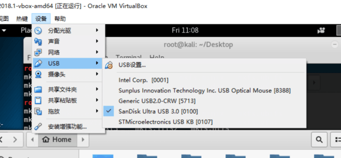 - 启动Kali虚拟机,进入Kali之后,点击VirtualBox的