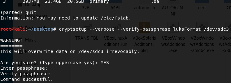 cryptsetup --verbose --verify-passphrase luksFormat /dev/sdc3确认覆盖分区,输入大写的YES,然后输入两遍密码之后,加密分区制作完毕